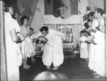 Arriba de la Dª Luz de Xangó nuestro director el Pai Armando Ayala; a la derecha de Nuestro Director Sr. Dondó, esposo de la Mãe Teta. (Las imágenes que están en el piso pertenecen a nuestro director y están integradas en su actual altar de Umbanda. La nota gráfica representa el cruzamiento de dichas imágenes y el bautismo de quienes están de rodillas.)