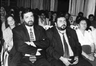 El Senador Jorge Gandini y el Edil Victor Mastrángelo presenciando el film.