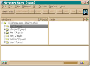 Una vez configurado el programa con los datos de Chasque, para ver los distintos "Grupos de Noticias" debes ingresar a donde dice "Window" o "Ventana" y hacer click en "Netscape News" o "Noticias de Netscape".