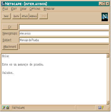 grupo de noticias oprime el botón que dice "Re:News" o "Re:Noticias". Para enviar una respuesta por correo electrónico al destinatario y que no aparezca publicada en el grupo de noticias haz click en "Re:Mail" o "Re:Correo". Si deseas participar en el grupo escribiendo un mensaje nuevo haz click en "To:News" o "A:Noticias". En todos los casos verás una ventana en la que