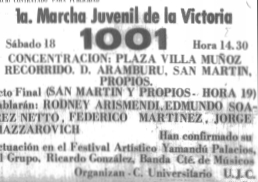 Ver también Marcha Nº1574 17 de Diciembre de 1971 Pág. 9 Congreso: Las puertas de una nueva etapa Unos cuatro mil delegados de lodo el país llenarán el Estadio Platense este fin de semana para la realización del Congreso Nacional de los Comités de Base del Frente Amplio... [Marcha Nº1575 24 de Diciembre de 1971 Págs. 10y11 Encuentro de compañeros y la unidad critica; [(AUDIO por Gabriel Quirici) Las elecciones de 1971] [Crisis política: la respuestas de los trabajadores] [Principales acontecimientos de 1971: |